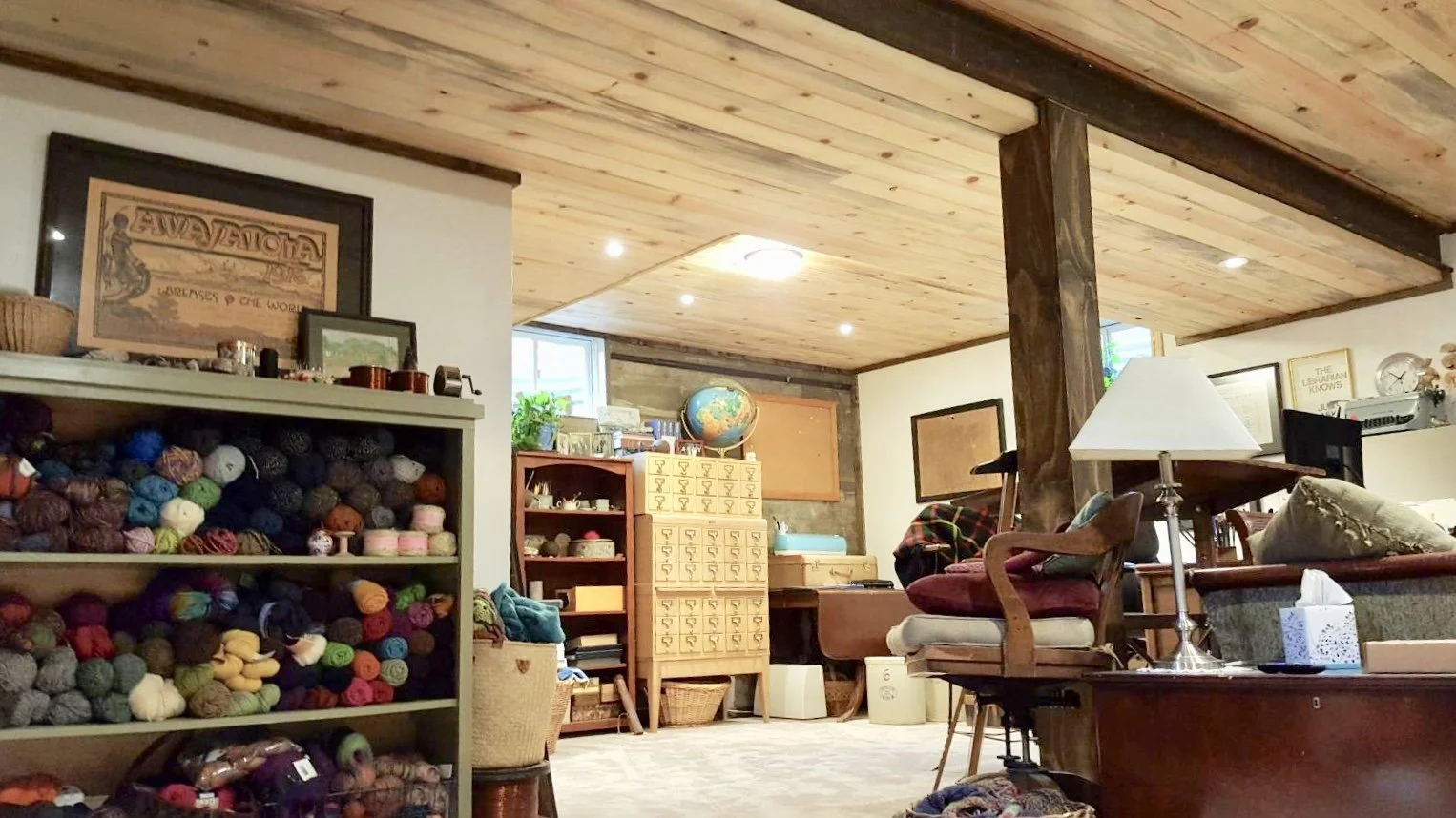 Five week turnaround; demolition, framing, drywall, beetle kill pine ceiling, trim and paint. Features exposed I-beam, drywall insets, steel posts hidden with stained wood, and all doors restored from habitat for humanity.